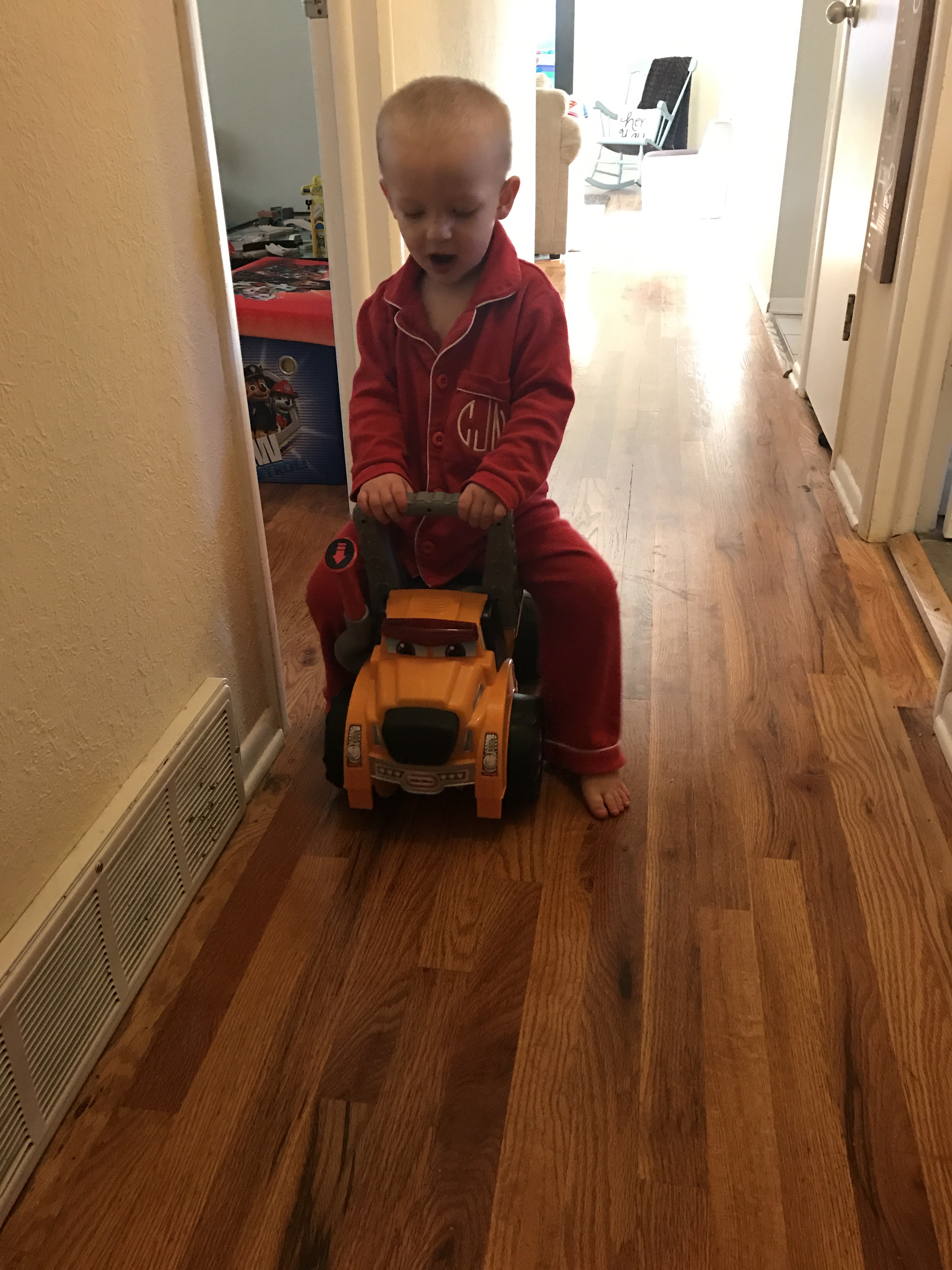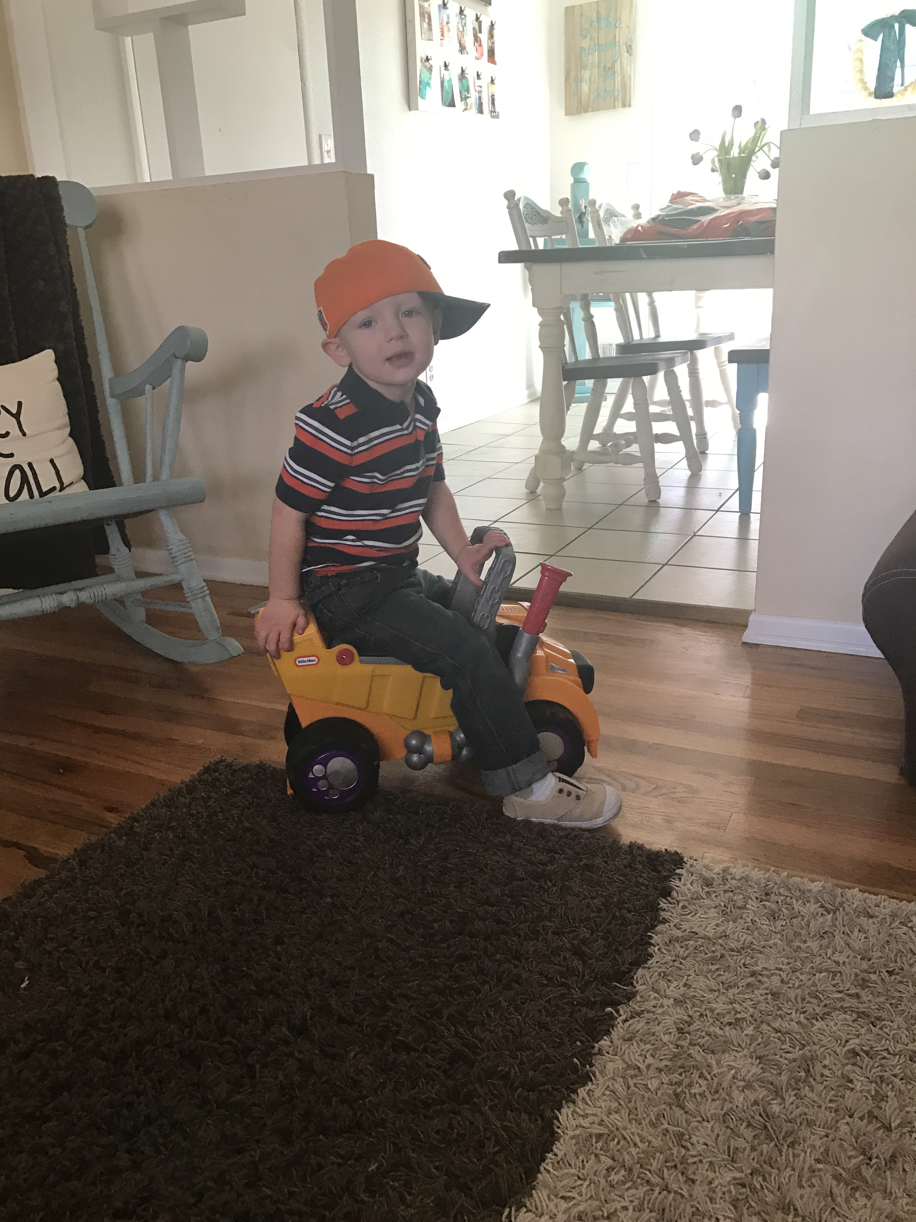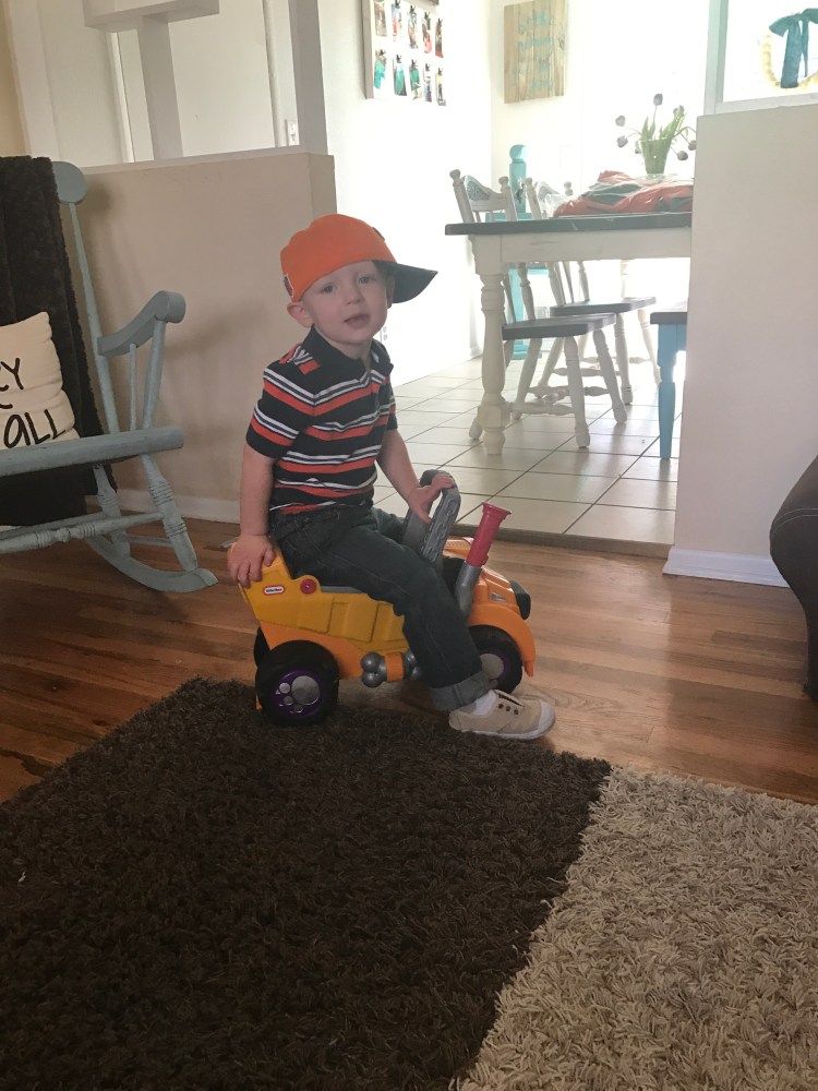 We get the little man dressed and ready to go. He takes a minute to play on his truck (which Nick has named Guy ironically enough).