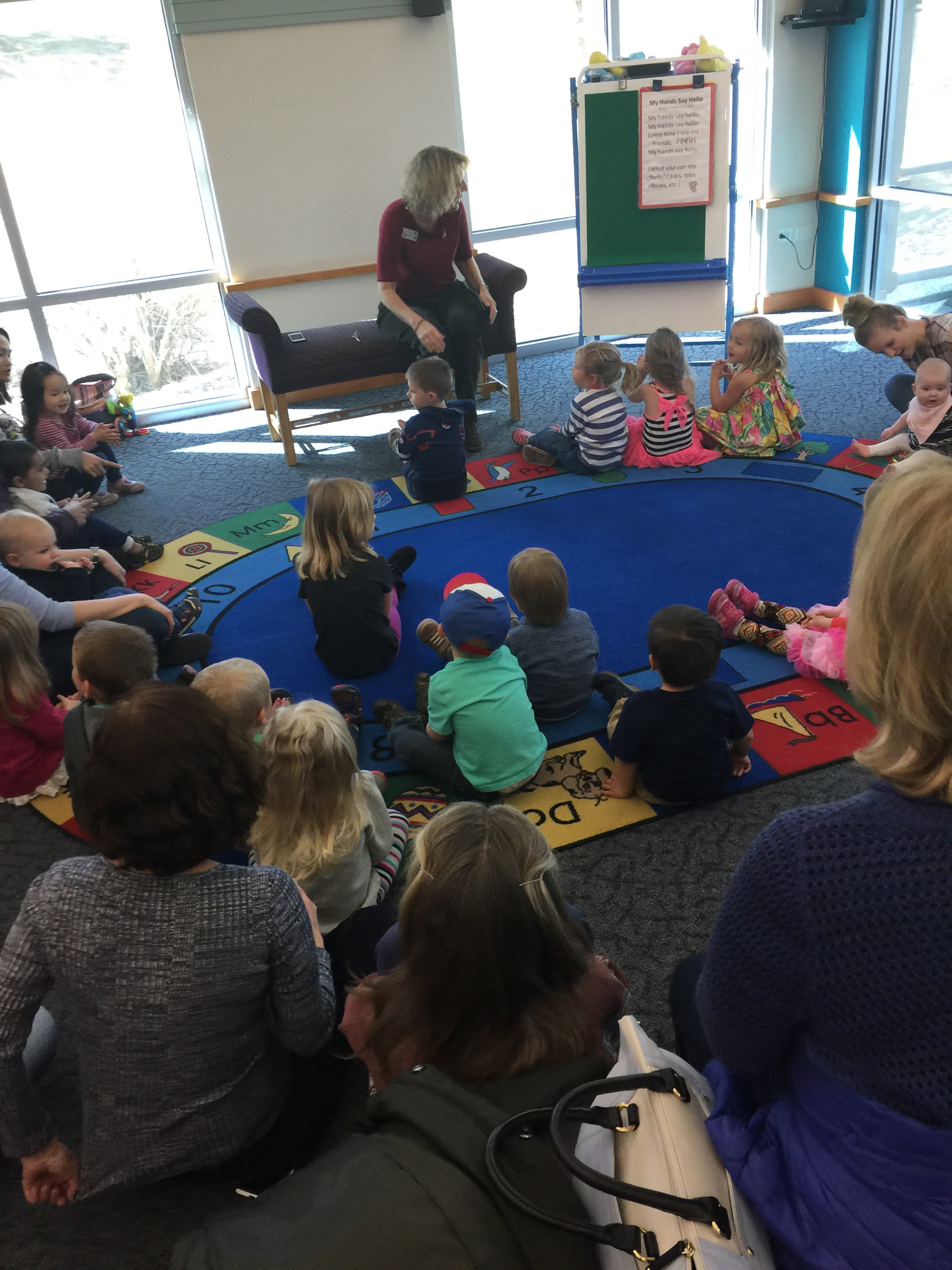Nick sends me this picture of our little munchkin at story time. Can you spot the kid with the hat on? Because he’s all about following daddy’s legacy in the always wearing a hat department. ๐