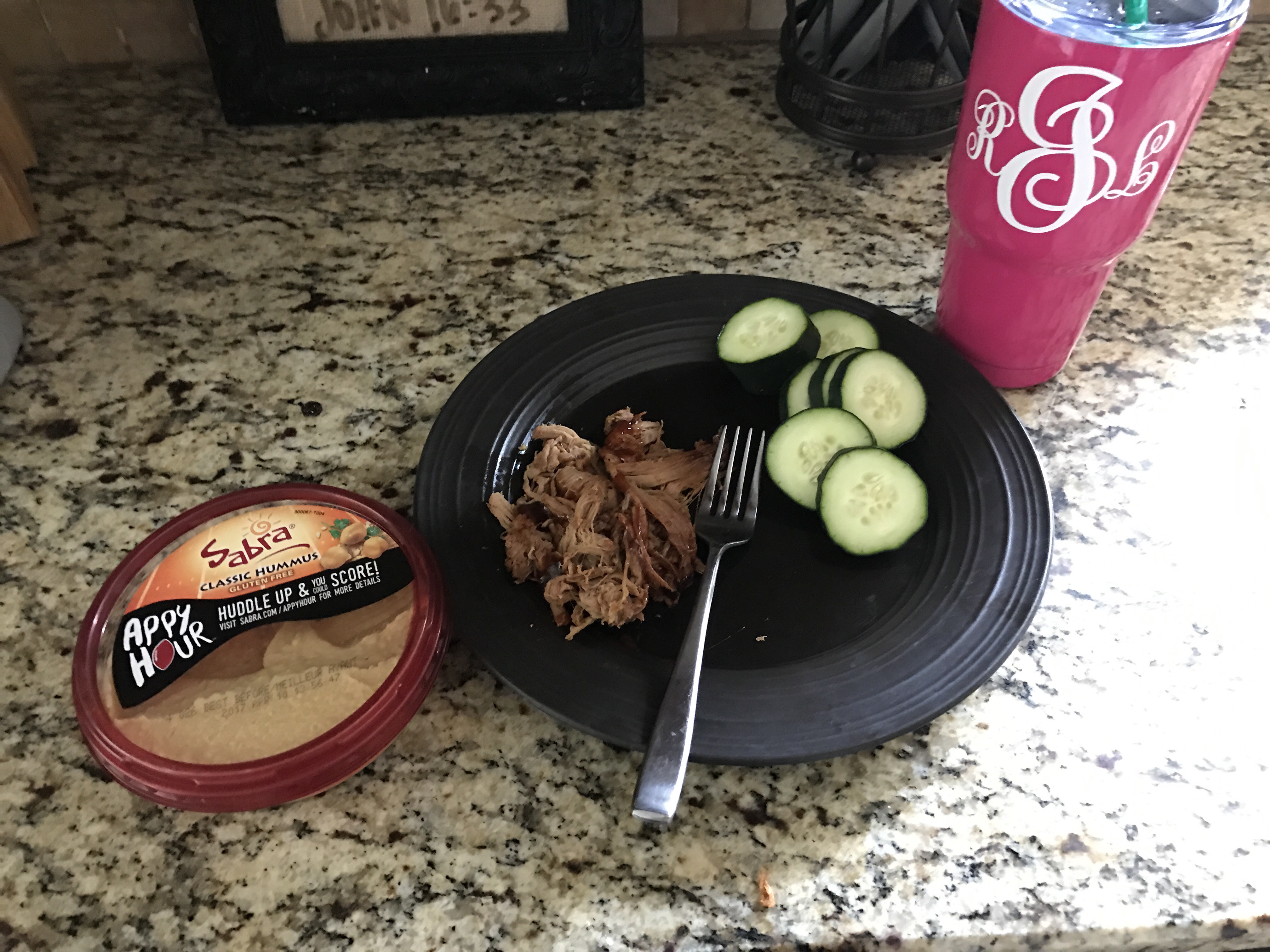 Caleb is napping and Nick is in the basement working out so I make my lunch. Leftover BBQ chicken and cucumbers & hummus is what I choose. I actually work on my ‘Friday Favorites’ blog while I eat and enjoy the silence.