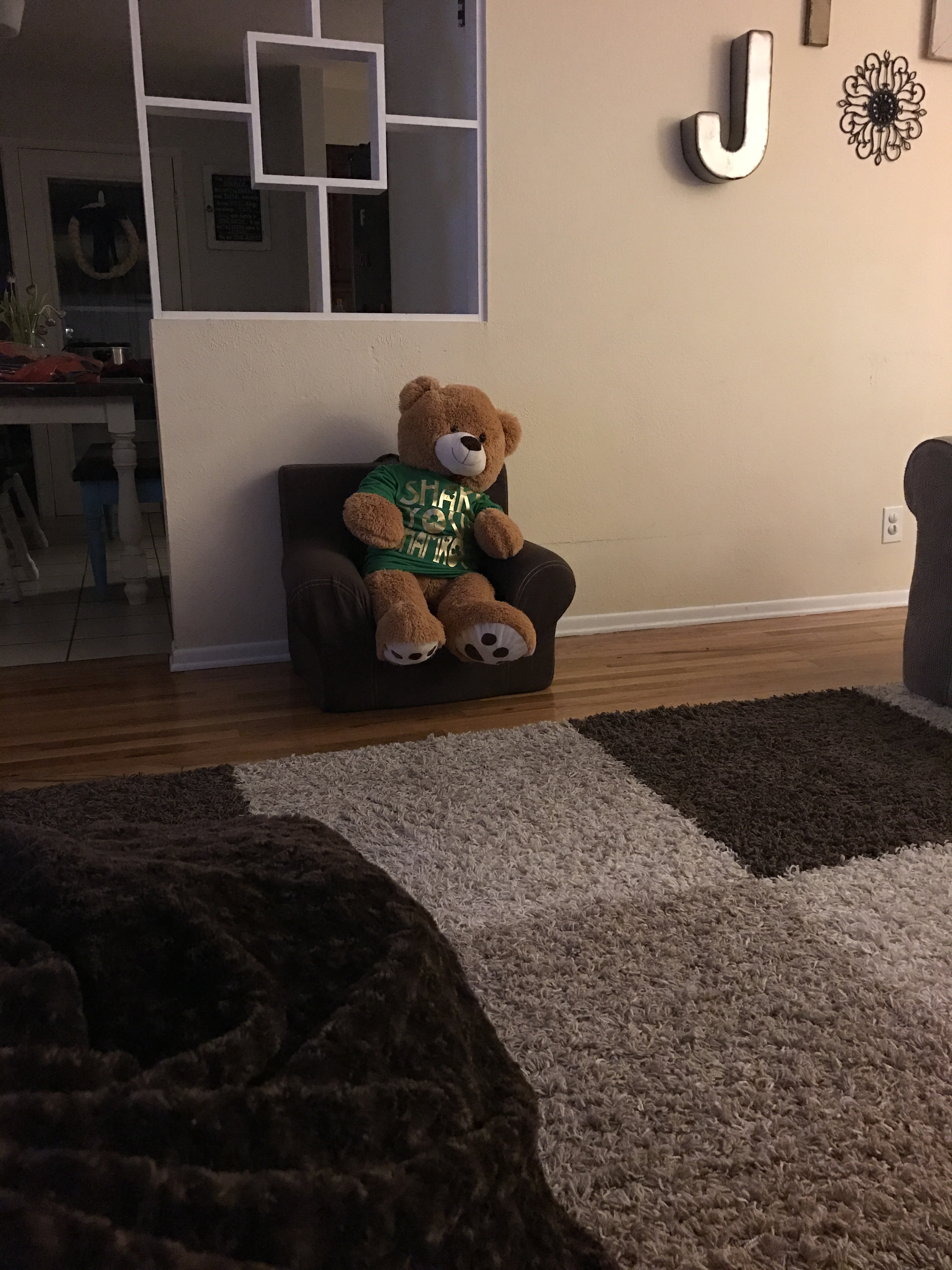 My view across the room. Caleb also came home with a gigantic bear named Paddy O’Neill for St Patrick’s Day. Paddy was also enjoying all the drama at the Grey Sloan Memorial Hospital.
