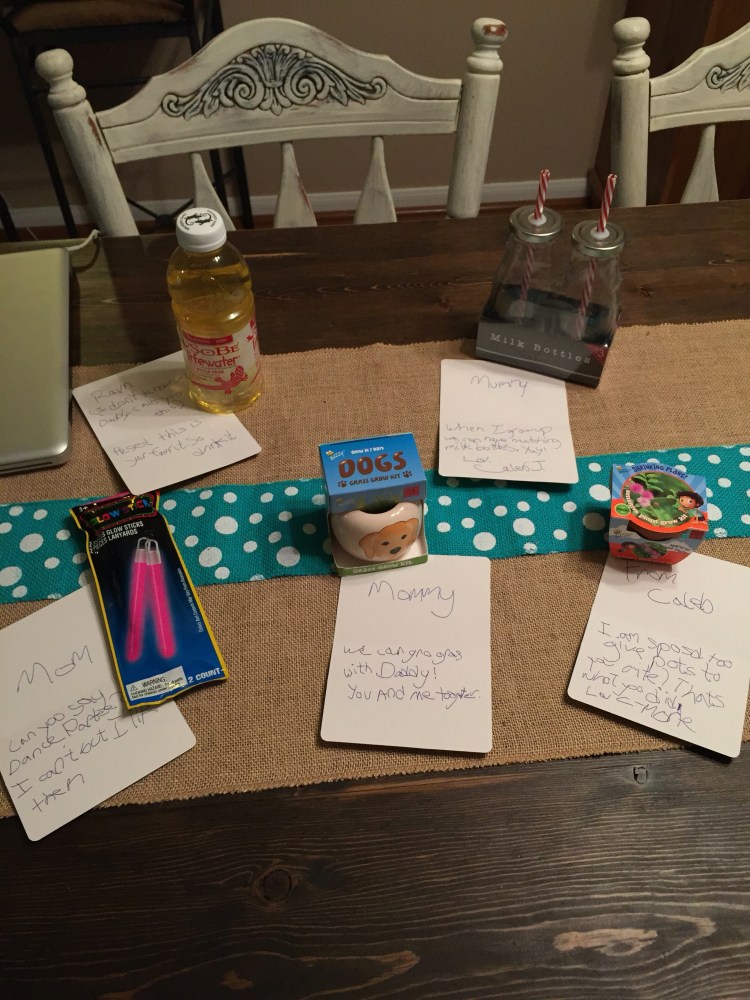 Here are all my goodies and notes from Caleb (Nick may or may not have had something to do with writing the notes).