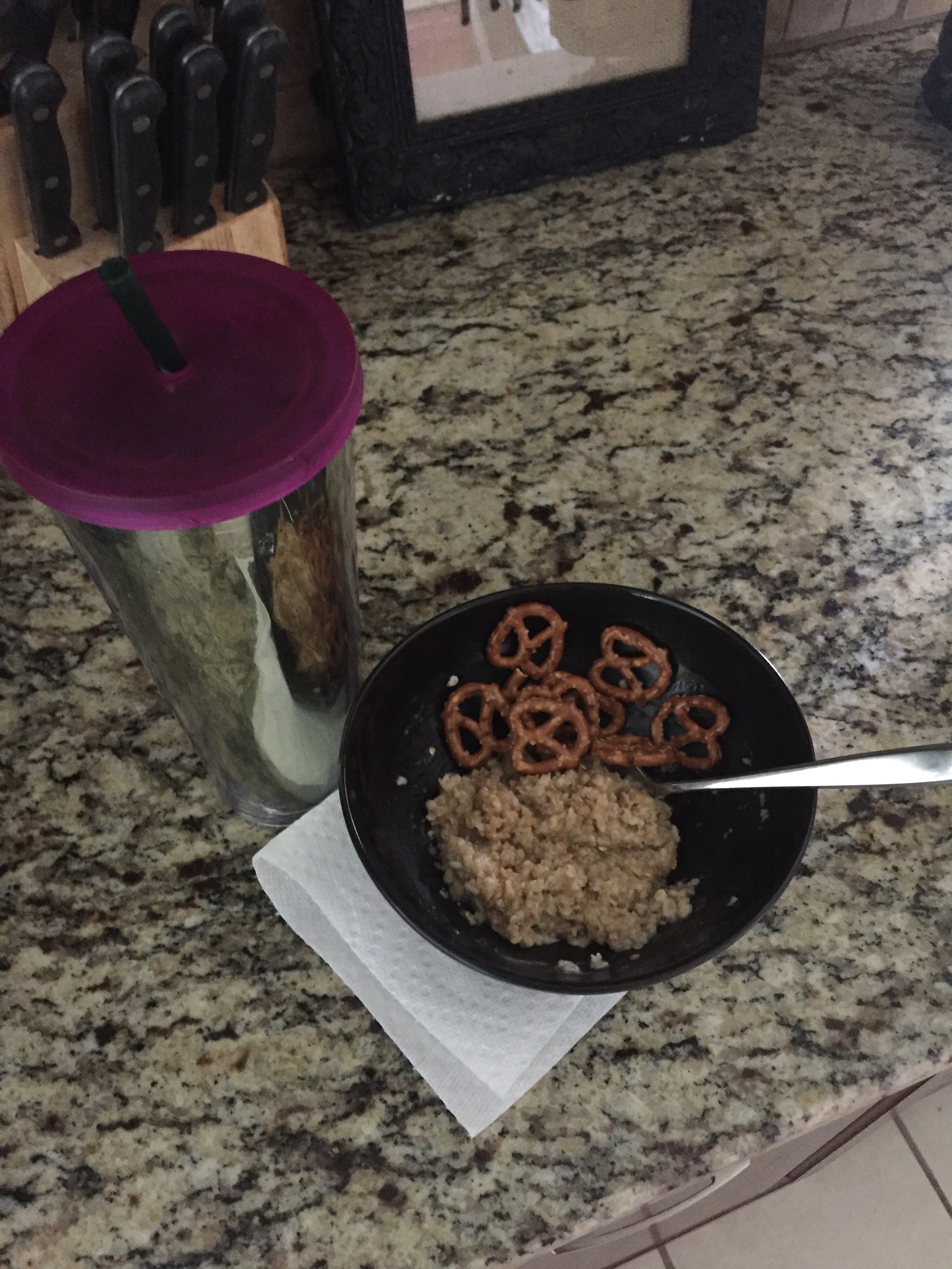 And now it was finally time for lunch around 1:15 pm (definitely later than I usually eat). Yes, that is oatmeal and pretzels. Yes, this has been a lunch choice for me for years and years. Yes, I know that it’s weird and I can feel you judging me.