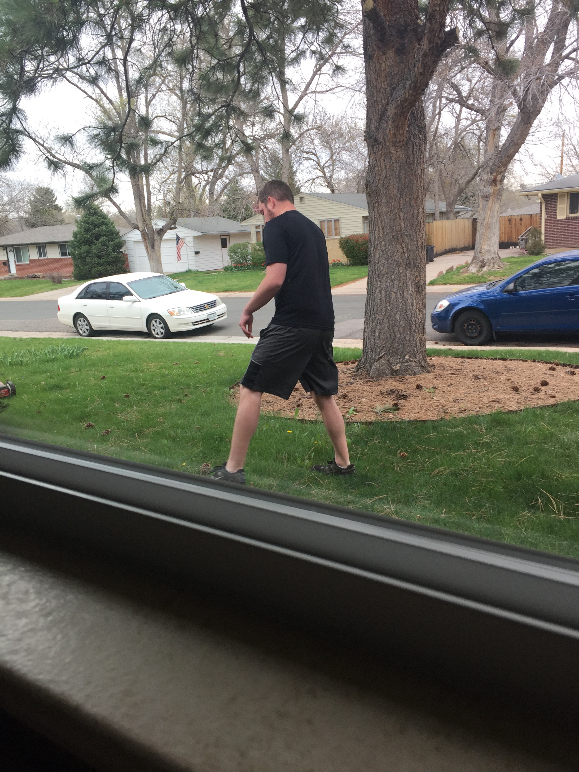 He then quickly ran back and forth between the windows because someone was outside mowing…